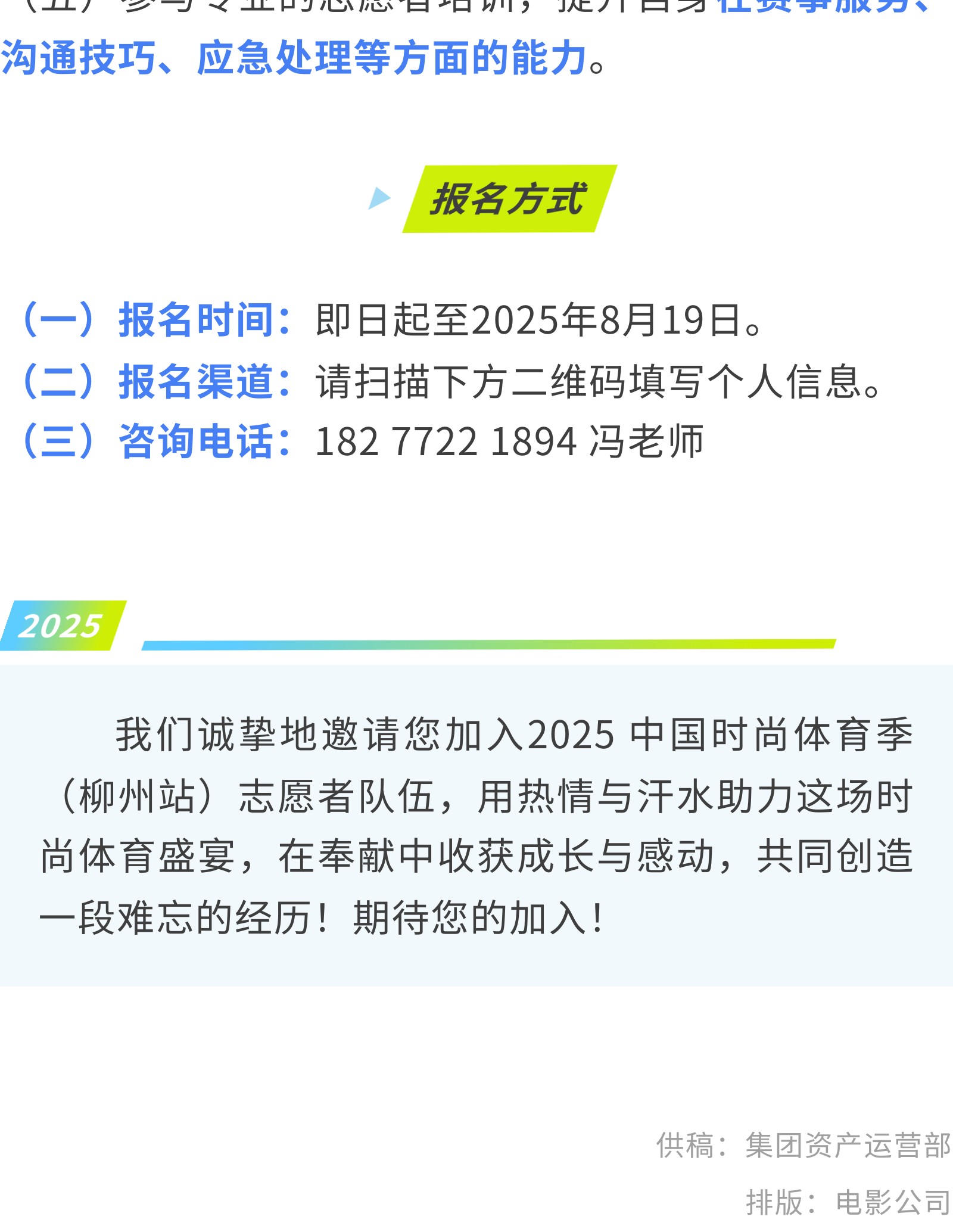 加入我們!2025 中國時尚體育季(柳州站) 志愿者招募中! 發(fā)布時間:2025年08月15日 10時來源:本站原創(chuàng)瀏覽:59 人次