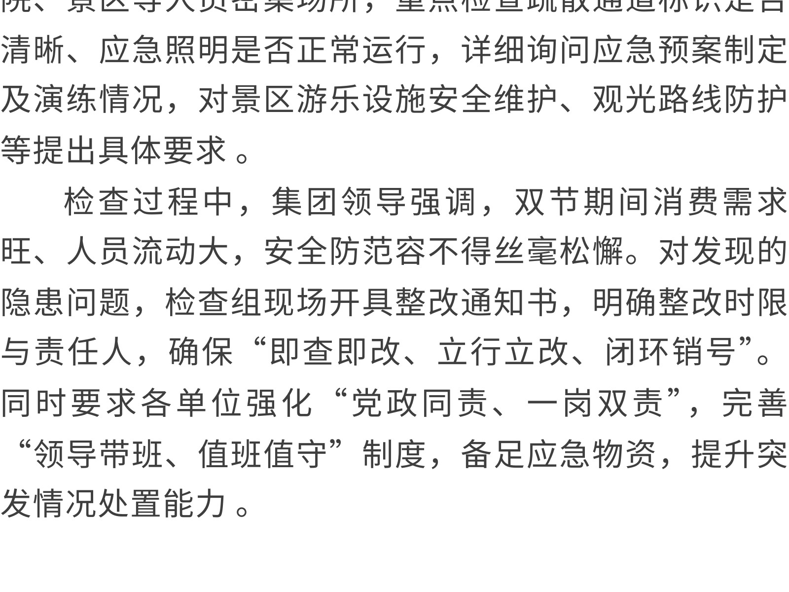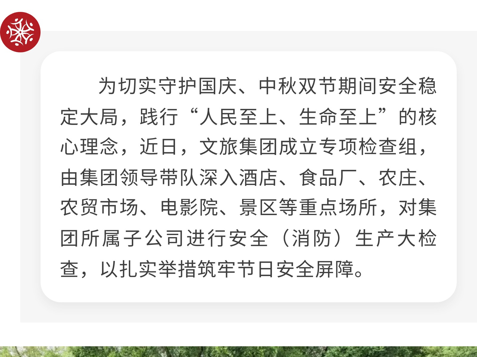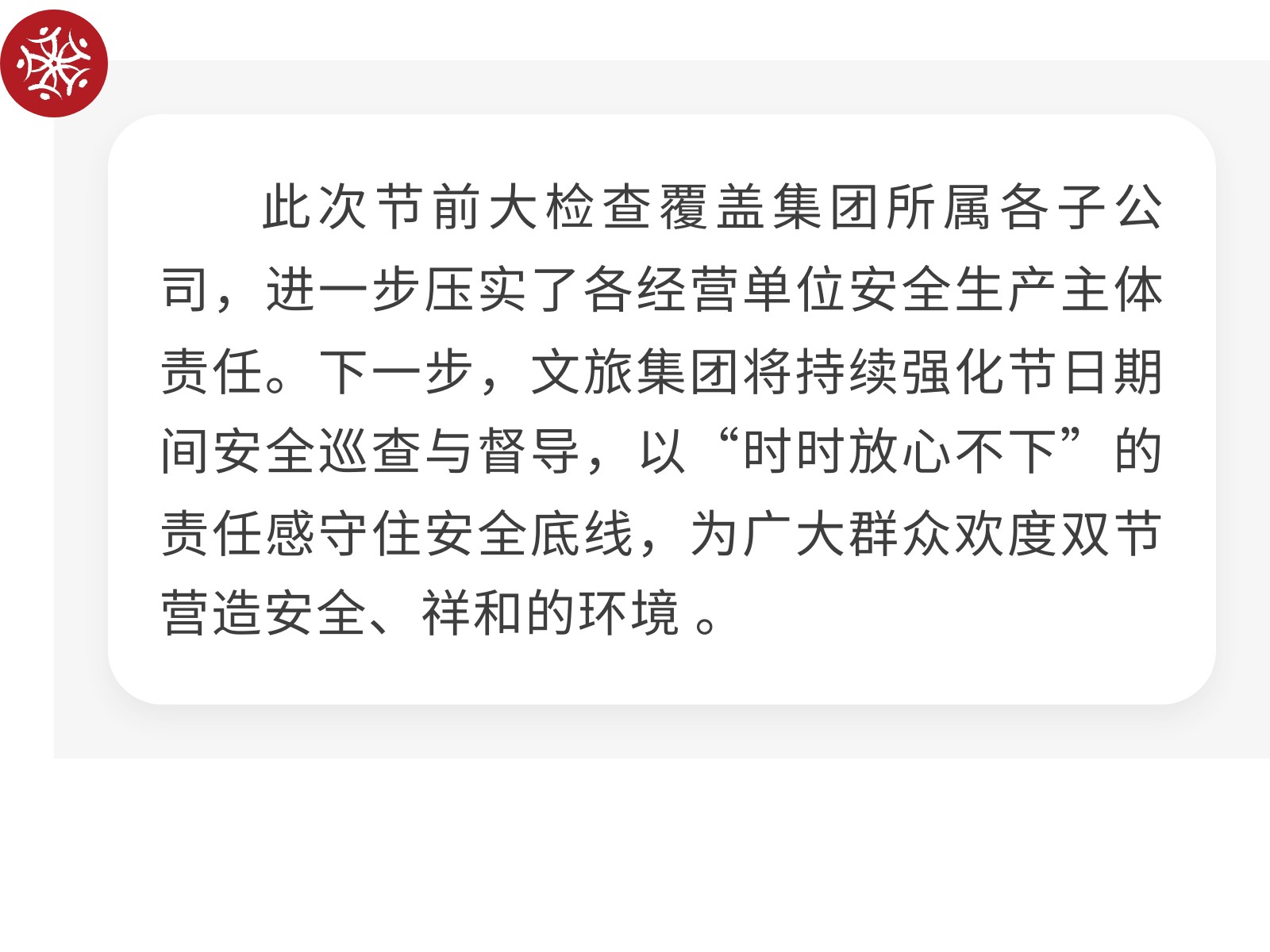 【筑牢安全防線 護(hù)航雙節(jié)安寧】文旅集團(tuán)開展節(jié)前安全(消防)生產(chǎn)大檢查 發(fā)布時(shí)間:2025年09月30日 17時(shí)來源:本站原創(chuàng)瀏覽:14 人次